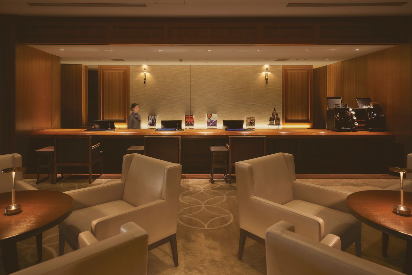 レセプションカウンターに使用されている天板は、リブランド以前まで多くのお客様に愛されたバー「ザ・フィフティーン」で使用されていた一枚板のバーカウンターをそのまま使用しています。長い歴史を刻んだこのカウンターが、今も変わらずお客様を温かく迎えています。