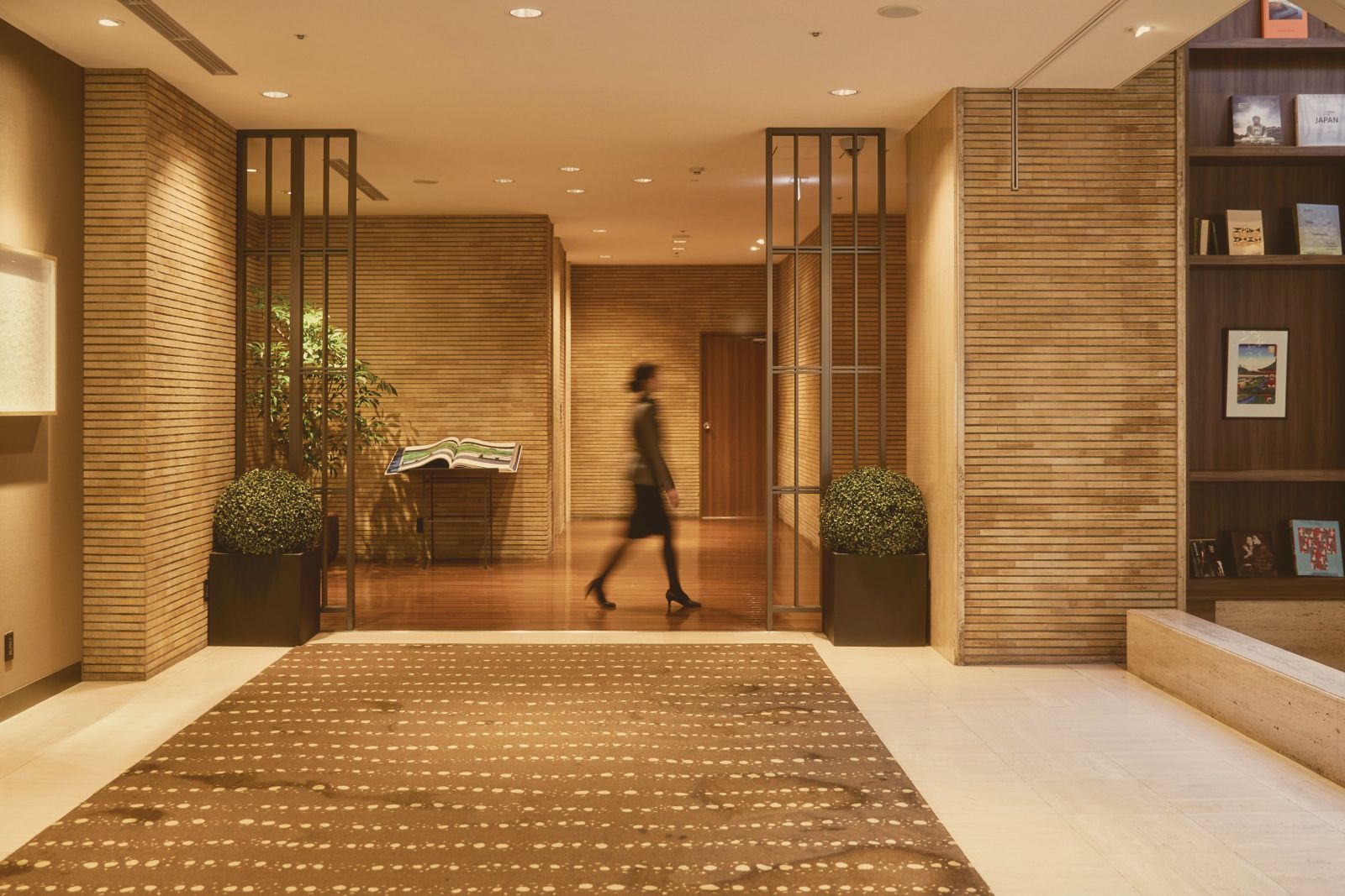 正面玄関から続くのは、水泡をイメージした芝パークホテルオリジナルデザインのカーペット。水面に幾重にも広がる波紋のように、輪の形は絶え間ないつながりを連想させ、その連なりによって平和と円満が無限に続くようにとの願いが込められた柄は、私たち芝パークホテルの「おもてなしの輪をつなげる」という心を表しています。